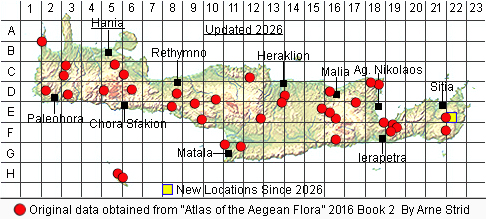 to S Anatolia and Cyprus. Fairly widespread, but scattered across Crete.